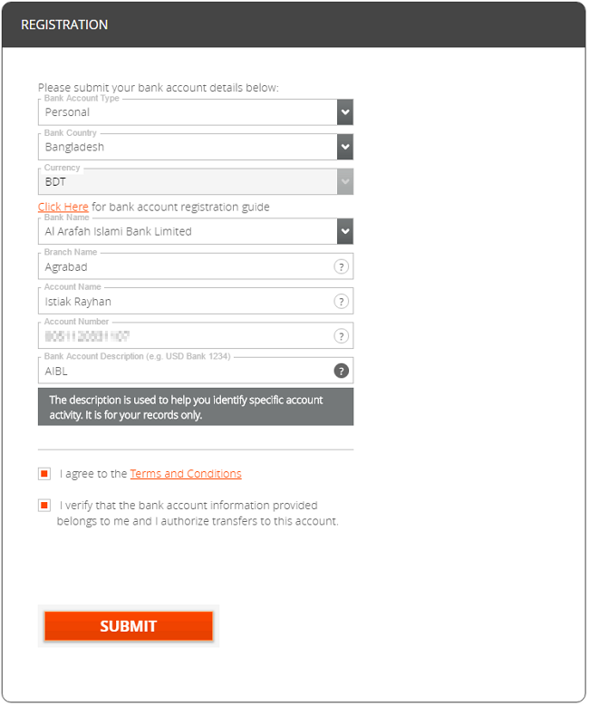 5. Then enter your bank account details (Bank name, Branch name, Account name, Account number and Bank account description).